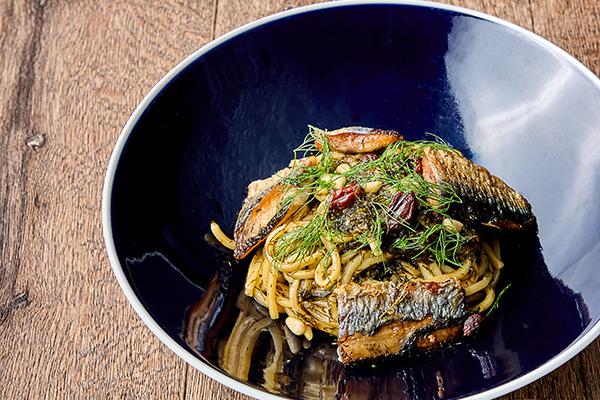 "Tonnarelli" pasta with sicilian-style sauce for pacific saury